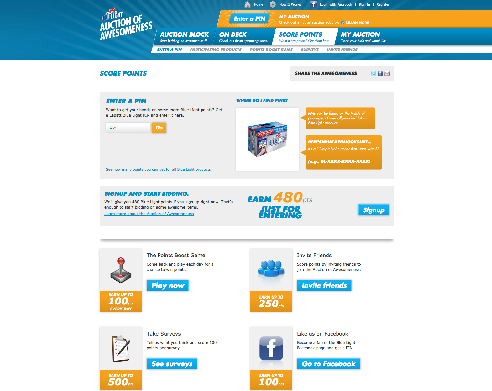 Another great program from Labatt, consumers would purchase a specially marked case of Labatt Blue Light and find a PIN inside that could be entered on the Labatt Blue Light Auction site for points, and then use those points to bid for awesome auction items.
